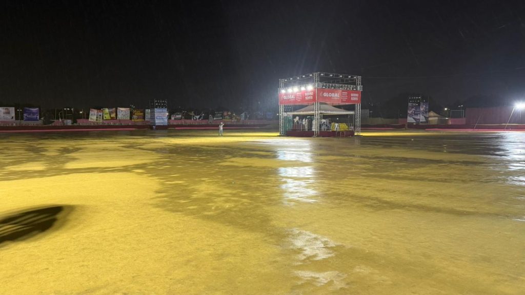 બંગાળની ખાડીમા હવાનુ હળવુ દબાણ સર્જાયા બાદ હવામાન વિભાગ દ્વારા 3 દિવસ વરસાદની આગાહી કરવામા આવી છે. જે અંતર્ગત ગઇકાલ સાંજથી શહેર પર વાદળો ખડકાયા બાદ 8 વાગ્યાથી પ્રથમ જોરદાર વરસાદ શરુ થયો હતો . ત્યારે મોડી રાત સુધી ઝાપટા સ્વરુપે ચાલુ રહેતા પાંચ કલાકમા 1। ઇંચથી વધુ પાણી વરસી જતા ખરે ટાણે વરસાદ આવતા ખેલૈયાઓ નિરાશ થયા હતા. અનેક સ્થળે પ્રાચીન અને અર્વાચીન ગરબીઓ બંધ રહેલ જેની સામે અમુક સ્થળોએ ચાલુ વરસાદે ખેલૈયાઓએ દાંડીયાની મોજ માણી હતી.