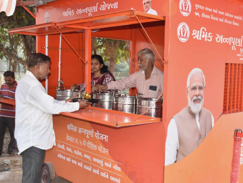 ઉપરાંત જે બાંધકામ સાઇટ પર 50 થી વધુ શ્રમિકો હોય તો તે સાઇટ પર ભોજન પુરુ પાડવામાં આવે છે. શ્રમિકોને પાંચ રૂૂપિયામાં રોટલી, શાક, કઠોળ, ભાત, અથાણું, મરચા અને ગોળ સહિતનું સ્વાદિષ્ટ ભોજન પુરુ પાડવામાં આવે છે. આ ઉપરાંત સપ્તાહમાં એક વખત સુખડી કે શિરાનું મિષ્ટાન પણ આપવામાં આવે છે. અમદાવાદ જિલ્લામાં 98 ગાંઘીનગરમાં 12, વડોદરામાં 21, સુરત જિલ્લામાં 40, રાજકોટમા 14, વલસાડમા 10, મહેસાણામાં 13,નવસારીમાં 9 પાટણમા 15 ભાવનગરમાં 6 ,આંણદમા 6 બનાસકાંઠાંમાં 8 ભરૂૂચમા 7 દાહોદમાં 5 જામનગરમા 11 ખેડામાં 4 મોરબીમા 6, પંચમહાલમા 1 અને સાંબરકાંઠામા 4 ભોજન કેન્દ્રો કાર્યરત છે.