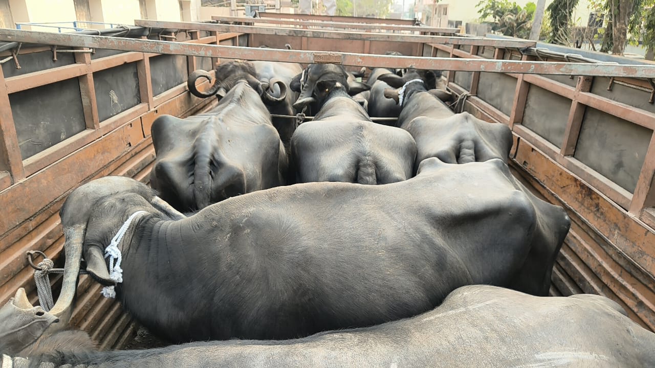 આ પછી કથિત રીતે પશુઓને કતલખાને કપાવવા માટે લઈ જવામાં આવતો હોવાની આશંકા પરથી ઉપરોક્ત આઈસર ટ્રકને અત્રે જામનગર માર્ગ પર આવેલા ધરમપુર ટોલ ગેઈટ પાસે અટકાવીને ચેકિંગ કરવામાં આવતા તેમાં 9 મોટી ભેંસ તેમજ ચાર નાના પાડરડા (પશુ) ભરેલા હોવાનું ધ્યાન આવ્યું હતું. આઈસરમાં ઉપરોક્ત તમામ 13 પશુઓને ટૂંકા દોરડા વડે ખીચોખીચ બાંધી અને હલનચલન પણ ન કરી શકે તેવી સ્થિતિમાં જોવા મળ્યા હતા. એટલું જ નહીં, ટ્રકમાં પશુઓ માટે ચારા કે પાણીની પણ વ્યવસ્થા ન હતી. આ પશુઓ બાબતે ટ્રકના ચાલક હમીર નેભા આંબલીયા (ઉ.વ. 34, રહે. હંજરાપર, તા. ખંભાળિયા) ને પૂછવામાં આવતા ઉપરોક્ત પશુઓ તે હંજરાપર ગામે રહેતા પ્રવીણભાઈ દેવાયતભાઈ આંબલીયાના ઘરેથી તેમની માલિકી પાસેથી લીધા હોવાનું તેમજ આ પશુઓને સુરત ખાતે રહેતા એક આસામીને આપવા માટે જતા હોવાનું જણાવ્યું હતું.
