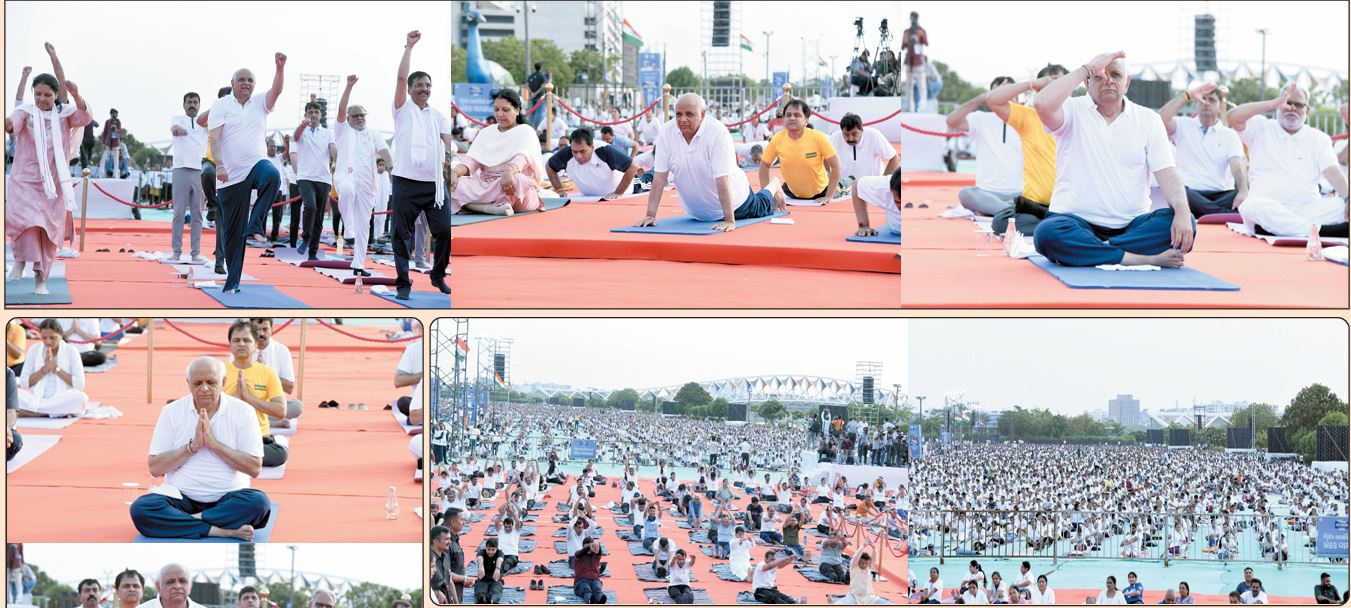 આંતરરાષ્ટ્રીય યોગ દિવસ – 2025ની ઉજવણીના ભાગરૂૂપે ગુજરાત રાજ્ય યોગ બોર્ડ, અમદાવાદ મ્યુનિસિપલ કોર્પોરેશન તથા જિલ્લા વહીવટી તંત્રના સંયુક્ત ઉપક્રમે સ્વસ્થ ગુજરાત, મેદસ્વિતામુક્ત ગુજરાત અભિયાન અંતર્ગત નિ:શુલ્ક પયોગ શિબિર – કોમન યોગ પ્રોટોકોલ પ્રશિક્ષણથનું આયોજન કરવામાં આવ્યું હતું. જેમાં 15 હજારથી વધુ શહેરીજનો આ યોગ શિબિરમાં સહભાગી બન્યા હતા. આ યોગ શિબિરમાં મુખ્યમંત્રી ભૂપેન્દ્ર પટેલ, ગૃહ વિભાગના રાજ્ય મંત્રી હર્ષ સંઘવી, ગુજરાત રાજ્ય યોગ બોર્ડના ચેરમેન તેમજ યોગસેવક શિશપાલ રાજપૂત, અમદાવાદના મેયર શ્રીમતી પ્રતિભા જૈન, જિલ્લા પંચાયત પ્રમુખ કંચનબા વાઘેલા, અમદાવાદ પશ્ચિમના સાંસદ દિનેશભાઈ મકવાણા, સર્વ ધારાસભ્યો, રમતગમત, યુવા અને સાંસ્કૃતિક પ્રવૃત્તિઓ વિભાગના અગ્ર સચિવ એમ.થેન્નારસન, અમદાવાદ મ્યુનિસિપલ કમિશનર બંછાનિધિ પાની, અમદાવાદ મ્યુનિસિપલ કોર્પોરેશન તેમજ જિલ્લા વહીવટી તંત્રના અધિકારીઓ, પદાધિકારીઓ તેમજ યોગસેવકો, યોગપ્રેમીઓ, શિક્ષકો, યુવાનો, વડીલો તેમજ મોટી સંખ્યામાં નગરજનો ઉપસ્થિત રહ્યા હતા.