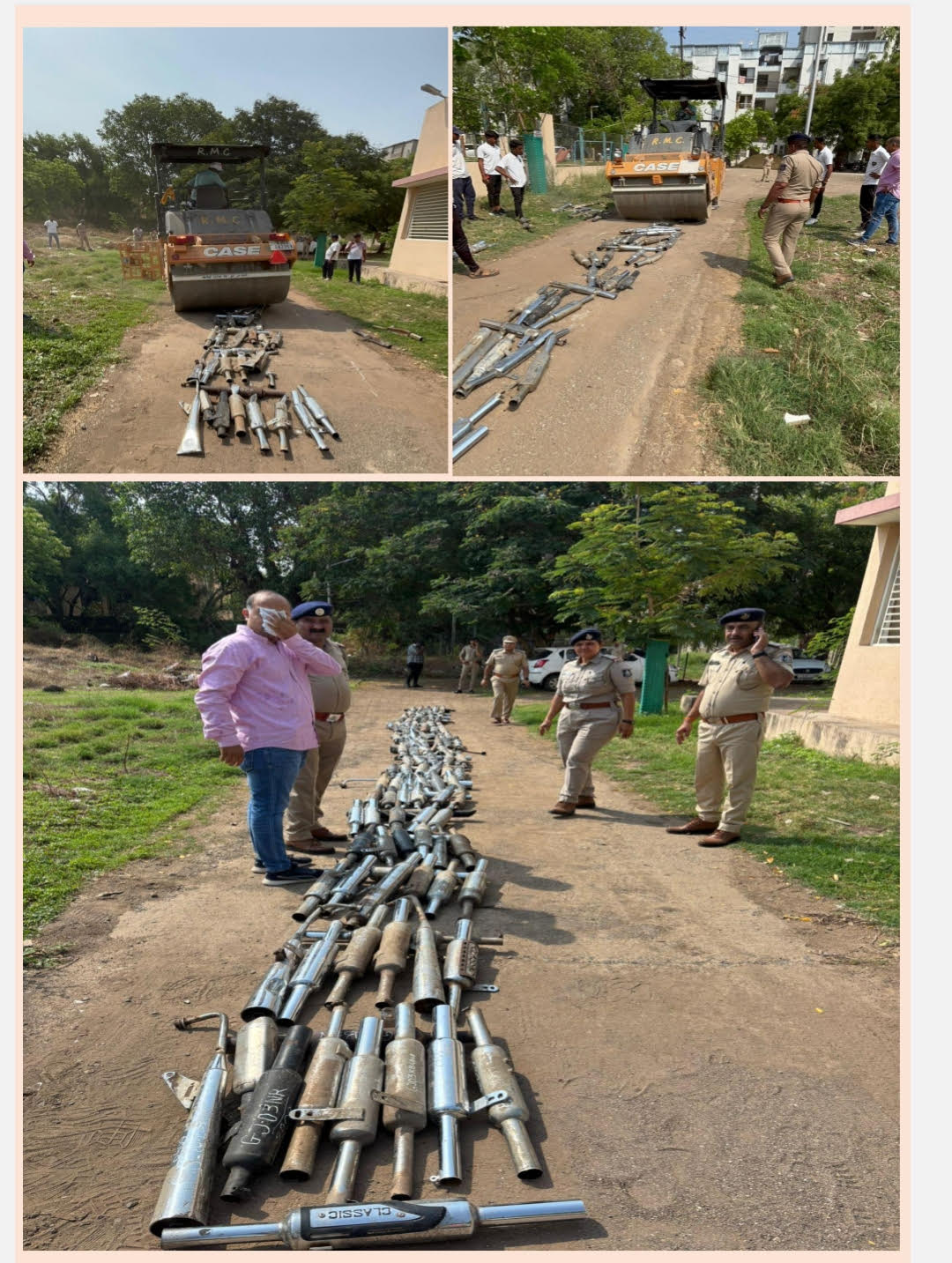 શહેરમા બુલેટનાં મોડીફાઇડ સાયલેન્સર સામે ટ્રાફીક પોલીસ હાથ ધરેલ ઝુંબેશમા 214 મોડીફાઇ સાયલેન્સર કબજે કર્યા હોય જેના પર રોલર ફેરવી દેવામા આવ્યુ હતુ. પોલીસ કમિશ્નર બ્રજેશકુમાર ઝા તથા અધિક પોલીસ કમિશ્નર મહેન્દ્ર બગડીયા ના માર્ગદર્શન હેઠળ નાયબ પોલીસ કમિશ્નર ટ્રાફિક પૂજા યાદવ અને ઇન્ચાર્જ એસીપી વી.જી.પટેલ સાથે આરટીઓનાં અધિકારી કેતન ખપેડ દ્વારા શહેરી વિસ્તારમાં કંપનીના માન્ય સાયલેન્સરની જગ્યાએ અનઅધિક્રુત રીતે વધુ ધ્વનિ પ્રદુષણ ફેલાવતા અને લોકોના આરોગ્યને નુકસાન પહોંચાડતા મોડીફાઇડ સાયલેન્સર ફિટ કરેલ હોય જેનો ઉપયોગ નીતિગત તેમજ કાનૂની દ્રષ્ટ્રીએ દંડનીય છે જેને ધ્યાને લઇ આવા મોટર સાયકલ/બુલેટ ચાલકો વિરુધ્ધ શહેરી વિસ્તારમાં અલગ-અલગ જગ્યાએ વિશેષ ડ્રાઇવનું આયોજન કરવામાં આવેલ હતું જે ડ્રાઇવ દરમિયાન અનઅધિકૃત રીતે ફિટ કરવામાં આવેલ કુલ-124 મોડીફાઇડ સાયલેન્સર કબજે લેવામાં આવેલ હતાં, જે મોડીફાઇડ સાયલેન્સર પર પોલીસ હેડ કવાટર ખાતે રોલર ફેરવી દઇ તેનો નાશ કરવામા આવ્યો હતો.