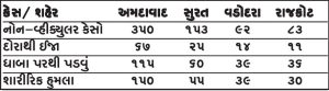 અમદાવાદમાં સૌથી વધુ 1,176 નોંધાયા છે. સામાન્ય દિવસો કરતા અહિં 41.10 ટકાનો વધારો નોંધાયો જ્યારે સુરતમાં 567 કેસ સાથે 32.95 % વધારો, રાજકોટમાં 365 કેસ 52.68% વધારો અને વડોદરામાં 363 કેસ સાથે 49.01% વધારો નોંધાયો છે. સૌથી વધુ ટકાવારીમાં વધારો પંચમહાલ (95.19%), વાવ-થરાદ (95.65%) અને અરવલ્લી (88.68%) માં જોવા મળ્યો હતો. જ્યારે તાપી, બનાસકાંઠા, જૂનાગઢ અને ડાંગ જેવા જિલ્લામાં કેસોમાં સામાન્ય ઘટાડો નોંધાયો હતો.