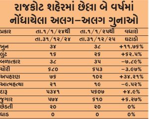 રાજકોટ શહેરમાં છેલ્લા બે વર્ષમાં ગુનાખોરીના ગ્રાફમાં નોંધપાત્ર ફેરફાર જોવા મળ્યો છે. જેમાં વર્ષ 2024માં ચોરીના 680 ગુના નોંધાયા હતા, જે વર્ષ 2025માં ઘટીને 653 થયા છે. દારૂૂના 5341 કેસો નોંધાયા હતા, જે વર્ષ 2025માં વધીને 5607 થયા છે. ખૂનના 34 કેસો હતા, જે 2025માં વધીને 38 થયા છે. લૂંટના ગુનામાં પણ વધારો જોવા મળ્યો છે. વર્ષ 2024માં 16 કેસોની સામે 2025માં 26 કેસો નોંધાયા છે.