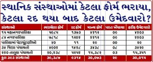 15 મહાનગરપાલિકાઓમાં 5985 ભરાયેલા ઉમેદવારી પત્રોમાંથી 1373 ફોર્મ રદ થયાં છે. 84 નગરપાલિકાઓમાં 7818 ફોર્મ ભરાયા હતા. એમાંથી જે તે કારણોસર 1206 ફોર્મ રદ થયાં હતા. જ્યારે 34 જિલ્લા પંચયાતોમાં 4906 ઉમેદવારીપત્રો ભરાયા હતા. એમાંથી 1468 ફોર્મ રદ થયાં હતા. એવી જ રીતે 260 તાલુકા પંચાયતોમાં ભરાયેલા 20,638 ઉમેદવારીપત્રોમાંથી 5256 ઉમેદવારી પત્રો રદ થયાં હતા.