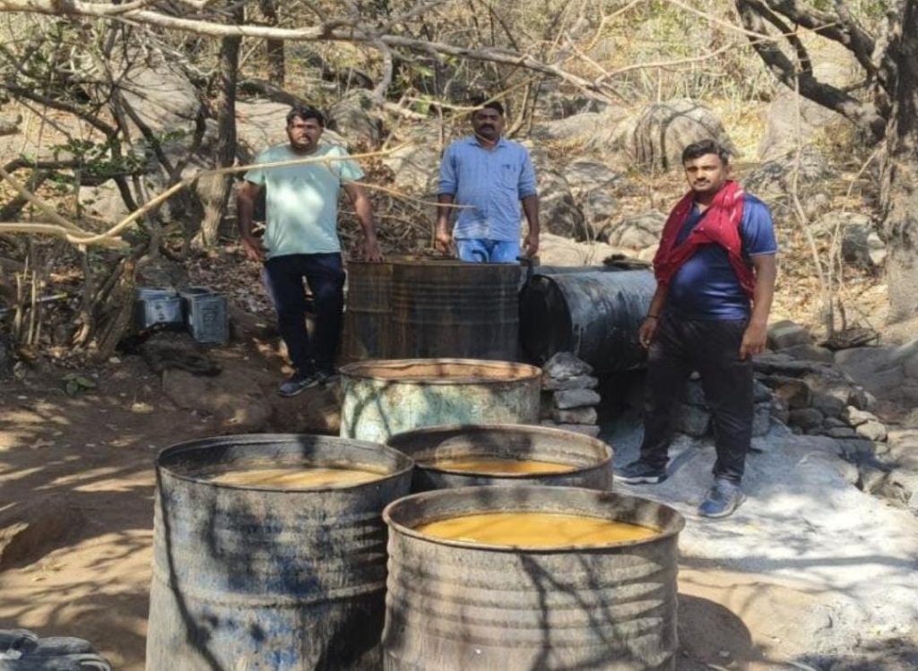 દેવભૂમિ દ્વારકા જિલ્લામાં પોલીસ અધિક્ષક નિતેશ પાંડેયની સૂચના મુજબ એલસીબીની ટીમ દ્વારા કરવામાં આવેલી કાર્યવાહીમાં શનિવારે એલ.સી.બી. પી.આઈ. કે.કે. ગોહિલના માર્ગદર્શન હેઠળ સ્ટાફ દ્વારા હાથ ધરવામાં આવેલા પેટ્રોલિંગ દરમિયાન એલ.સી.બી.ના એ.એસ.આઈ. અરજણભાઈ ચંદ્રવાડીયા, જયદેવસિંહ જાડેજા, પરેશભાઈ સાંજવા અને મનહરસિંહ જાડેજાને મળેલી ચોક્કસ બાતમીના આધારે ભાણવડના બરડા ડુંગર વિસ્તારમાં ધામણીનેશ પાસેના તળાવ નજીક ધમધમતી દેશી દારૂૂની ભઠ્ઠી પર દરોડો પાડવામાં આવ્યો હતો.