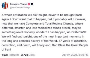 અમેરિકાના રાષ્ટ્રપતિ ડોનાલ્ડ ટ્રમ્પે ફરી એકવાર ચેતવણી આપતા આજે રાત્રે તેની આખી સભ્યતા ખતમ કરવાની ધમકી આપી છે. ટ્રમ્પે કહ્યું કે જો સમયમર્યાદા પૂરી થાય તે પહેલાં કોઈ કરાર નહીં થાય, તો આજે આજે રાત્રે એક આખી સભ્યતા ખતમ થઈ જશે, જેને ફરી ક્યારેય પાછી લાવી શકાશે નહીં.