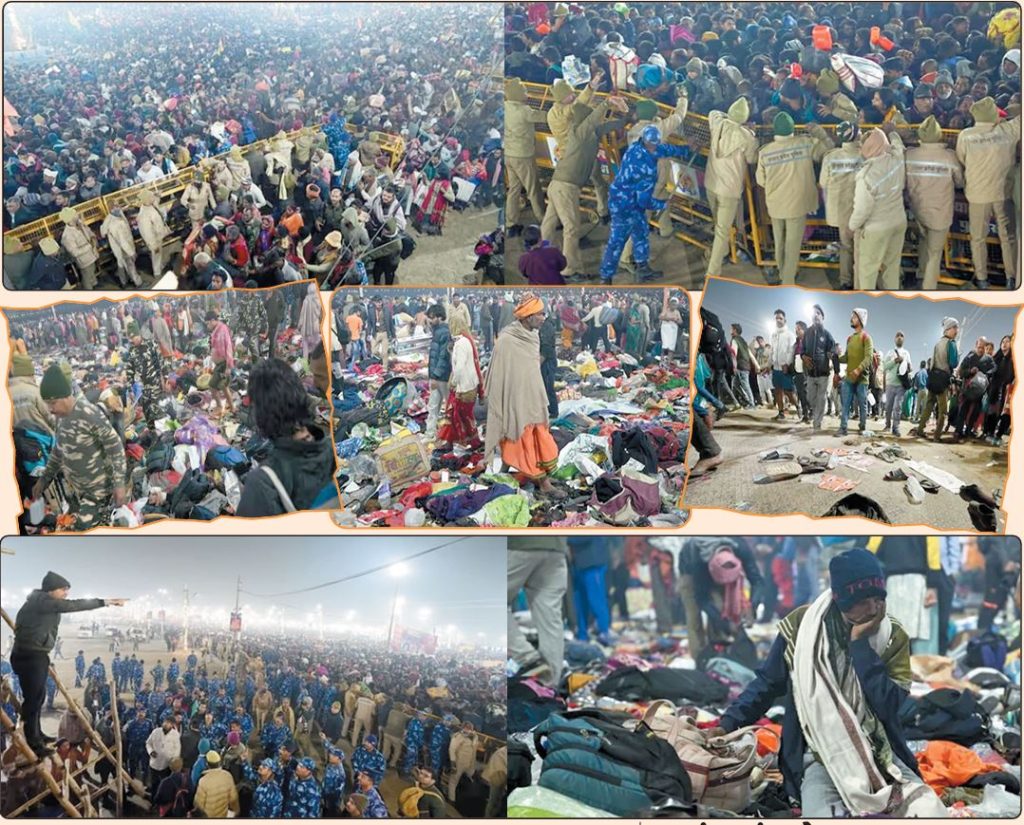 પ્રયાગરાજમાં ચાલી રહેલ 12મા મહાકુંભમાં આસ્થા ઉપર યમરાજે વાર કર્યો હોય તેમ આજે મૌની અમાવસ્યાના અમૃત સ્નાન સાથે જ વહેલી પરોઢિયે ધક્કામુક્કી અને નાસભાગ થતા અનેક લોકો ભીડમાં કચડાઇ ગયા હતા તો અમુકના શ્ર્વાસ રૂંધાઇ ગયા હતા. સંગમ ઘાટના લગભગ બે કિલોમીટર વિસ્તારમાં ચોતરફ બૂટ-ચપ્પલ અને માલસામાન વેરવિખેર જોવા મળ્યો હતો અને બેકાબૂ ભીડ વચ્ચે કોઇ લોકો બચાવો… બચાવોની ચીસો પાડતા હતા, તો કોઇ લોકો પોતાની સાથે આવેલા સ્વજનોના નામના પોકાર કરીને શોધતા નજરે પડયા હતા. ગઇકાલે મંગળવારે મોડી સાંજથી જ સંગમ ઘાટ પાસે અભૂતપૂર્વ ભીડ એકઠી થઇ હતી. અને પ્રહર બદલતા જ વહેલી પરોઢિયે બ્રહ્મમુહૂર્તમાં અમૃત સ્નાન માટે રાહ જોઇ રહ્યા હતા. રાત્રે લગભગ એકાદ વાગ્યે સ્નાન માટે બેરિકેડ હટાવાતા જ કલાકોથી બેઠેલી ભીડ બેકાબૂ બની હતી. ગાંડા- ઘેલાની માફક લોકોએ ઘાટ તરફ દોટ મૂકી હતી. સ્થાનિક પોલીસે ભીડને અટકાવવાના પ્રયાસો કર્યા તો લોકો આડસો ઉખેડીને ઘાટ તરફ દોડ્યા હતા.