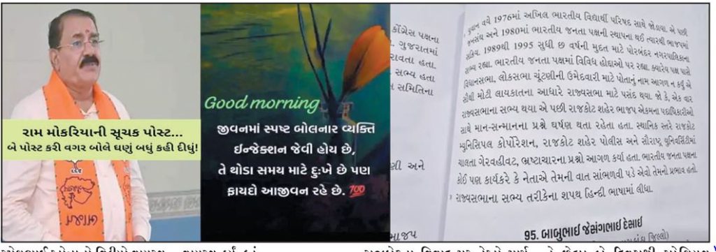દિલ્હીથી બેઠા બેઠા સોશિયલ મીડિયામાં રામભાઈ મોકરીયા અલગ અલગ પોસ્ટર શેર કરી રહ્યા છે. રામભાઈ મોકરીયાના પોસ્ટરો વગર બોલે ઘણું બધું કહી જાય છે. ગઈકાલે પણ રામભાઈએ કથાકાર રમેશભાઈ ઓઝાનો વિડીયો વાયરલ કર્યો હતો. સાથે જ પોતાના વિશે પુસ્તકમાં લખેલું લખાણ પણ વાયરલ કર્યું હતું.