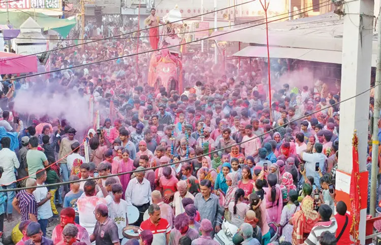 દિવ્ય અને ભવ્ય શોભાયાત્રા નગરના જાહેર માર્ગો પર થઇને સાત વાગ્યાના અરસામાં લાલબાગ ખાતે પહોંચી હતી. જયાં ભગવાનને ધાણી, અને મગસ ધરાવીને આરતી ઉતારવામાં આવી હતી. ત્યારબાદ સેવકો, વૈષ્ણવો અને મોટી સંખ્યામાં શ્રાદ્ધાળુઓએ અબીલ ગુલાલ સહિત વિવિધ રંગોની છોળ ઉડાડીને હર્ષોલ્લાસ સાથે રંગોત્સવ ઉજવીને વ્રજભૂમિમાં હોળી ખેલ્યાની અનુભૂતિ સાથે ધન્ય બન્યા હતા.