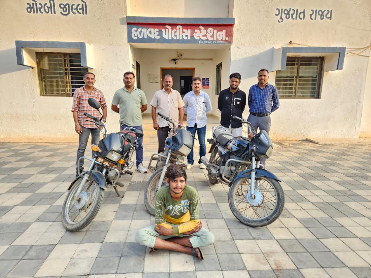 ત્યારે હળવદ પોલીસે શક્તિ સુખાભાઈ કેશાભાઈ વિછીયા ગામ- રાજપર અને હાલ- કુડામા રહેતો મોટરસાયકલ લઈને નિકળતા પોલીસે પુછપરછ કરી વિશ્વાસમાં લેતાં બે મોટરસાયકલ ચોરી કરી હોવાની કબુલાત કરતા પોલીસે ત્રણેય મોટરસાયકલ કબજે કર્યા છે જેમાં આરોપી શક્તિ સુખાભાઈ કેશાભાઈ વિછીયા સામે અગાઉ મોરબી સીટી બી ડિવિઝન ખાતે ત્રણ અને હળદ પોલીસ સ્ટેશન ખાતે એક ગુનો દાખલ થયેલો છે હાલમાં પોલીસે ત્રણ મોટરસાયકલ કબજે કર્યા છે જેમાં બે હળવદમાં અને એક ધાંગધ્રાનો કેસ ડિટેક્ટ કરાયો છે પોલીસે કબજે કરેલાં જીજે 13 એમ એમ 7253, જીજે 13 એસ 0159 અને જીજે13 આર 0424 ત્રણેય મોટરસાયકલની કિંમત 60 હજારનો મુદ્દામાલ કબજે કરીને આગળની કાર્યવાહી હાથ ધરી છે.