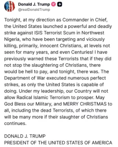 અમેરિકી રાષ્ટ્રપતિએ સ્પષ્ટ કર્યું કે અમેરિકા ‘કટ્ટર ઇસ્લામી આતંકવાદને પાંગરવા નહીં દે.’ પોસ્ટના અંતમાં ટ્રમ્પે સેનાને આશીર્વાદ આપતા ક્રિસમસની શુભેચ્છાઓ પાઠવી અને કહ્યું કે જો ખ્રિસ્તીઓની હત્યાઓ ચાલુ રહેશે, તો આગળ વધુ આતંકવાદીઓ માર્યા જશે.
