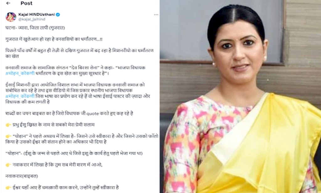 સામાજિક કાર્યકર અને હિન્દુત્વવાદી નેતા કાજલ હિન્દુસ્થાનીએ દક્ષિણ ગુજરાતમાં આદિવાસીઓનું ધર્માંતરણ થતું હોવાના દાવા સાથેની એક પોસ્ટ કરી હતી. સોશિયલ મીડિયા પર કરેલી પોસ્ટમાં તેણે કેટલાક વીડિયો અને તસ્વીરો પણ શેર કરી છે. જેના અનુસાર છેલ્લા પાંચ વર્ષમાં દક્ષિણ ગુજરાતમાં મિશનરીઓ દ્વારા ધર્માંતરણનો ખેલ ઝડપથી વધી રહ્યો છે. આદિવાસી સમુદાયના સામાજિક સંગઠન દેવ બિરસા સેનાએ કહ્યું કે, પભાજપના ધારાસભ્ય મોહન કોંકણી ધર્માંતરણની આ રમત પાછળનાં મુખ્ય સૂત્રધાર છે.