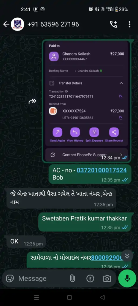 ત્યારે કોઈ અજાણ્યા નંબરમાંથી એમને ફોન આવ્યો હતો. જેમાં સામેના વ્યક્તિએ કહ્યું હતું કે, તમારી એલઆઇસીની એક પોલિસી પાકી ગઈ છે. એનું પેમેન્ટ તમારા ખાતામાં કરાવું છું, એમ કહી સામેવાળી વ્યક્તિએ રૂૂ. 10 મહિલાના ખાતામાં પેમેન્ટ જમા કરાવતા એનો ટેક્સ મેસેજ આવ્યો હતો. બાદમાં સામેવાળી વ્યક્તિએ ફરી રૂૂ. 10,000 અને બાદમાં રૂૂ. 30,000 જમા કરાવ્યાનો મહિલાને ટેક્સ મેસેજ આવ્યો હતો. બાદમાં એ ભાઈનો મહિલા ઉપર ફોન આવ્યો હતો. જેમાં એણે કહ્યું હતું કે, તમારા ખાતામાં મારાથી ભૂલથી રૂૂ. 27,000 જમા થઇ ગયા છે. તો મને પાછા ફોન પેથી જમા કરાવોને. એમ ખેલાડી મહિલા શ્વેતાબેને પોતાના ખાતામાં બેલેન્સ ચેક કર્યા વિના સામેવાળા ભાઈને પોતાના ખાતામાંથી રૂૂ. 27,000 ફોન પેથી મોકલી આપ્યા હતા.