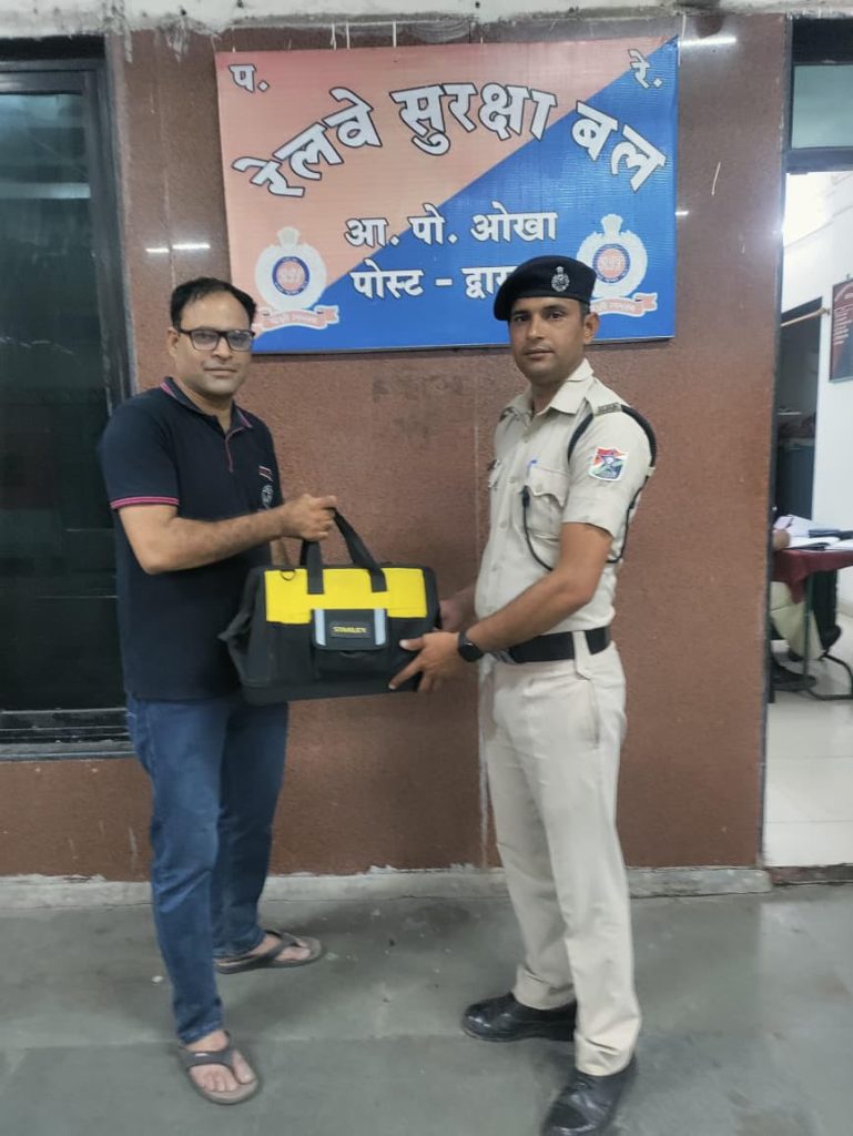 18 માર્ચ 2026 ના રોજ ’રેલ મદદ’ પોર્ટલ દ્વારા માહિતી મળી હતી કે ટ્રેન નંબર 20952 જયપુર-ઓખા એક્સપ્રેસના કોચ નંબર ઇ/4, સીટ નંબર 13 પર એક મુસાફર પોતાની બેગ ભૂલી ગયા છે. માહિતી મળતાની સાથે જ RPF ટીમ તાત્કાલિક સક્રિય થઈ હતી અને જરૂૂરી કાર્યવાહી શરૂૂ કરવામાં આવી હતી.ટ્રેન ઓખા સ્ટેશન પર પહોંચતા જ RPF ના આસિસ્ટન્ટ સબ ઇન્સ્પેક્ટર પ્રહલાદ વધારા અને કોન્સ્ટેબલ દીપક શર્મા દ્વારા સંબંધિત કોચની સઘન તપાસ કરવામાં આવી હતી, જેના પરિણામે બેગ સુરક્ષિત રીતે મળી આવી હતી. તપાસ દરમિયાન બેગના માલિકની ઓળખ બ્રિજેશ શર્મા, રહેવાસી મહેશ નગર, જયપુર (રાજસ્થાન) તરીકે થઈ હતી. મળી આવેલી બેગની તપાસ કરતા તેમાં અંદાજે ₹1,0,000 ની કિંમતના ઇલેક્ટ્રિક ટૂલ્સ મળી આવ્યા હતા, જે સુરક્ષિત કસ્ટડીમાં રાખવામાં આવ્યા હતા.સામાન મળી આવ્યા બાદ, ઓખા પોસ્ટ પર હાજર રહેવા પર કોન્સ્ટેબલ નરેશ કુમાર ઢાકા દ્વારા મુસાફરને તેમનો સામાન વિધિવત રીતે સોંપવામાં આવ્યો હતો.