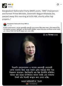બાંગ્લાદેશના ભૂતપૂર્વ વડા પ્રધાન અને બાંગ્લાદેશ નેશનાલિસ્ટ પાર્ટી (BNP)ના અધ્યક્ષ બેગમ ખાલિદા ઝિયાનું આંજે સવારે લાંબી બીમારી બાદ અવસાન થયું. ખાલિદાએ સંસદીય ચૂંટણી માટે ઉમેદવારી પત્રો એક દિવસ પહેલા જ ભર્યા હતા. તેમ 12 ફેબ્રુઆરીએ ચૂંટણી યોજાવાની છે.