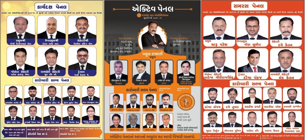 છ હોદ્દેદારોને દસ કારોબારી સભ્યોની 16 બેઠકો માટે કુલ 51 ઉમેદવારોમાં ત્રણ પેનલો ચાર વખત સેક્રેટરી રહી ચૂકેલા સિનિયર ધારાશાસ્ત્રી દિલીપભાઈ જોષીની કાર્યદક્ષ પેનલ, એડવોકેટ પરેશ મારુની સમરસ પેનલ અને વર્તમાન સહિત ત્રણ વખત પ્રમુખ ચૂંટાયેલા બકુલ રાજાણીની એક્ટિવ પેનલ મેદાનમાં આવતા રોમાંચક જંગ જામ્યો છે.વકીલોના આંતરિક વર્તુળોમાંથી જાણવા મળ્યા મુજબ બારની ચૂંટણીમાં ભાજપ લીગલ સેલના બે જૂથો અંદરખાને સક્રિય થયા હોય જ્ઞાતિવાદ અને ક્રોસ વોટિંગ થવાની સંભાવના સિનિયરો દ્વારા વ્યક્ત કરવામાં આવી રહી છે. ત્યારે બારની પ્રતિષ્ઠા અને આબરૂૂ જાળવવા માટે સિનિયર વકીલોએ આગળ આવવું જોઈએ એવો મત પ્રવર્તી રહ્યો છે. તારીખ 20મીએ સવારે 9:00 કલાકે બપોરના ત્રણ કલાક દરમિયાન ચૂંટણીનું મતદાન યોજાશે. ત્યારબાદ સાંજના મતગણતરી હાથ ધરવામાં આવશે અને મોડી રાત સુધીમાં પરિણામ જાહેર કરી દેવામાં આવશે.
