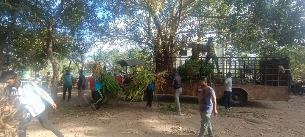 જામનગર શહેરમાં ગેરકાયદે રીતે ઘાસ ચારાનો વેચાણ કરવામાં આવે છે, અને તેમાંય ખાસ કરીને કાલાવડ નાકા બહાર નદીને દબાવીને ત્યાં કેટલાક ઘાસ વિક્રેતાઓ દ્વારા મોટા પાયે દબાણ સર્જીને ઘાસના વાડાઓ ઊભા કરી દેવાયા હોવાથી તે આશરે 30 હજાર ફૂટ જેટલી જગ્યા ખુલ્લી કરાવવા માટે આજે સવારે મહાનગરપાલિકા દ્વારા મેગા ડીમોલેશન હાથ ધરવામાં આવ્યું હતું. જામનગર મહાનગરપાલિકાની એસ્ટેટ શાખા તેમજ સોલિડ વેસ્ટ શાખાની બંને ટીમોના આશરે 40 જેટલા કર્મચારીઓની મદદથી વહેલી સવારે 8.30 વાગ્યાથી મેગા ડીમોલેશન હાથ ધરવામાં આવ્યું હતું. જેના માટે સિટી એ. ડિવિઝનના પી.આઇ. એન.એ.ચાવડા સહિતના પોલીસ અધિકારી કર્મચારીઓનો ચુસ્ત બંદોબસ્ત મુકવામાં આવ્યો હતો. ઉપરોક્ત સ્થળે અલગ અલગ સાત જેટલા ઘાસના વાડા ખડકી દેવાયા હતા, જેના પતરા, સેડ, ફેન્સીંગ સહિતનું તમામ દબાણ દૂર કરી લેવાયું હતું. અને આશરે 30,000 ચોરસ ફૂટ જગ્યા ખુલ્લી કરાવવામાં આવી છે. ઉપરોક્ત સ્થળે વેચાણ માટે મૂકવામાં આવેલું આશરે 200 મણ જેટલું ઘાસ, કે જે મહાનગરપાલિકાની અલગ અલગ ચાર મોટી ટ્રોલીમાં જમા કરી લેવાયું હતું, અને તમામ ઘાસને મહાનગરપાલિકા સંચાલીત ઢોરના ડબ્બામાં મોકલી દેવામાં આવ્યું છે.