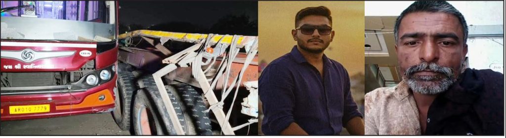 રાજકોટ-પોરબંદર નેશનલ હાઈવે પર જેતપુરના નવાગઢ નજીક આજે ગમખ્વાર અકસ્માત સર્જાયો હતો, જેમાં બે લોકોના કમકમાટીભર્યા મોત નિપજ્યા છે.મળતી માહિતી મુજબ બસ અને માછલી ભરેલા ટ્રેલર વચ્ચે જોરદાર ટક્કર થતાં ટ્રેલર રોડની નીચે ખાબક્યું હતું. આ દરમિયાન રસ્તા પરથી પસાર થતા એક નિર્દોષ બાઈક ચાલક તેમજ ત્યાં ઉભેલા એક વ્યક્તિ ટ્રેલર નીચે કચડાઈ જતા બંનેએ ઘટનાસ્થળે જ દમ તોડ્યો હતો. અકસ્માત એટલો ભયાનક હતો કે મૃતકોના અંગો શરીરથી અલગ પડી ગયા હતા.મૃતકોની ઓળખ ભાભલુભાઈ વાસુરભાઈ લાલુ (ઉ.વ. 45, સરધારપુર જેતપુર) અને કરણ નિલેશભાઈ દાણીધારીયા (ઉ.વ. 22, ગોંડલ) તરીકે થઈ છે.