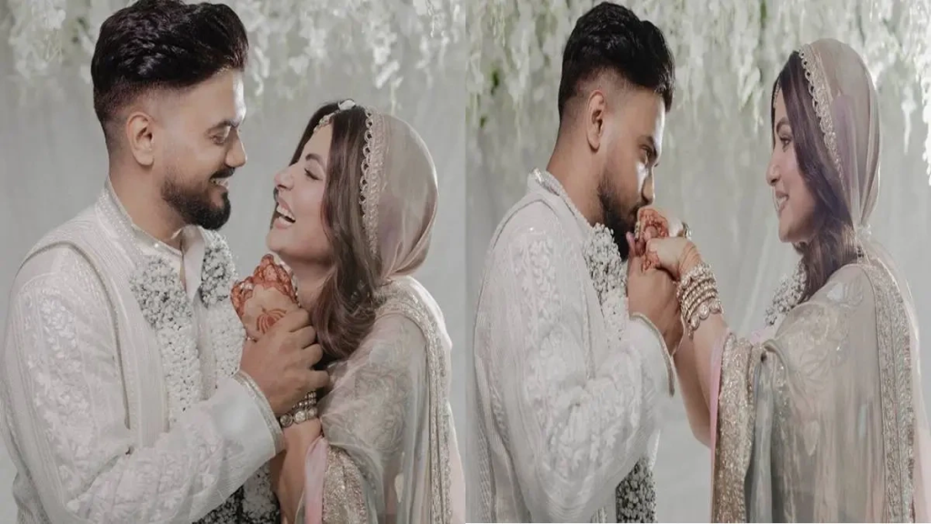 હિના ખાનના લગ્નના સમાચારથી તેના ચાહકો ખુશ થયા, પરંતુ સાથે જ તેઓ આઘાતમાં પણ છે કારણ કે તેના લગ્ન વિશે કોઈને ખબર પડી નહીં. હિનાએ તેના ઓફિશિયલ ઇન્સ્ટાગ્રામ પર તેના લગ્નના ફોટાઓની પૂરી સિરીઝ શેર કરી છે. ફોટામાં જ્યારે હિના ખાન સાદી પેસ્ટલ રંગની સાડીમાં ખૂબ જ સુંદર દેખાતી હતી ત્યારે રોકી પણ સફેદ રંગની શેરવાનીમાં તેની પત્નીને કોમ્પ્લીમેન્ટ બનાવતા જોવા મળ્યા હતા. બંને એકબીજાને પ્રેમથી જોતા જોવા મળે છે, જ્યારે બીજા ફોટામાં રોકી હિનાના હાથને ચુંબન કરી રહ્યો છે.