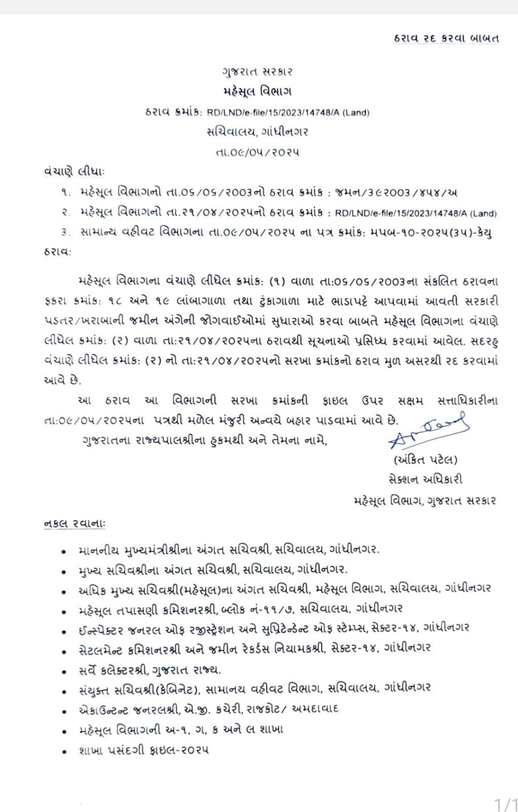 ગઈકાલે મહેસુલ વિભાગના એકશન અધિકારી અક્તિ પટેલ દ્વારા ઠરાવ બહાર પાડવામાં આવ્યો છે. જેમાં જણાવાયું છે કે લાંબાગાળા અને ટૂંકાગાળા માટે ભાડાપટ્ટે આપવામાં આવતી સરકારી પડતર કે ખરાબાની જમીન અંગેની જોગવાઈઓમાં સુધારાઓ કરવા બાબતે મહેસુલ વિભાગે તા.21/9/2025નાં રોજ ઠરાવથી સુચનાઓ પ્રસિધ્ધ કરવામાં આવી હતી. જે ઠરાવને મુળ અસરથી રદ કરવામાં આવે છે.