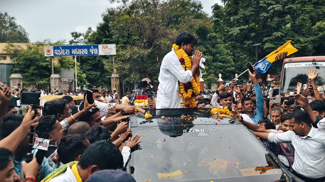 વડોદરા જેલમાથી 80 દિવસ બાદ જામીન પર છુટેલા ‘આપ’ ના ધારાસભ્ય ચૈતર વસાવા આજે જેલની બહાર આવતા જ આપના કાર્યકરો અને સમર્થકોએ તેનુ રોકસ્ટારની માફક સ્વાગત કર્યુ હતુ કાર્યકરોએ જેલના દરવાજેથી જ ચૈતર વસાવાને ખભે બેસાડી લીધા હતા , ત્યારબાદ ચૈતર વસાવાએ વિશાળ સરઘસ કાઢયુ હતુ.