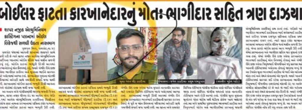 ગુજરાત મિરરના ગઇકાલ તા. 11 ના અંકમાં પાના નં. 12 ઉપર બોઇલર ફાટતા ‘કારખાનેદારનું મોત, ભાગીદાર સહિત ત્રણ દાઝયા’ તેવા હેડીંગ સાથે શાપર નજીક વીરવા રોડ ઉપર ગોલ્ડન ગેઇટ નં. 1 મા આવેલ પ્રીસિજન એલોયકાસ્ટ નામના કારખાનામા સર્જાયેલ દૂર્ઘટના અંગેના સમાચાર પ્રસિધ્ધ થયા હતા.