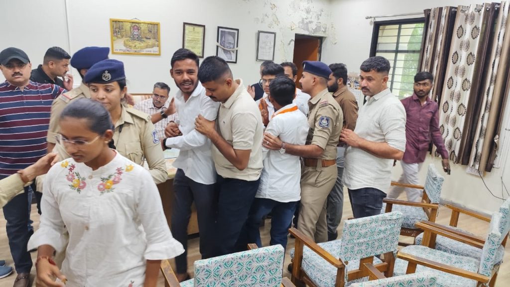 દિવાળીના વેકેશનમાં શૈક્ષણિક કાર્ય શરૂ રાખનાર શાળા સંચાલકો સામે કાર્યવાહી કરવાની રજૂઆત કરવા ગયેલા અખિલ ભારતીય વિદ્યાર્થી પરિષદ અને પોલીસ વચ્ચે જિલ્લા શિક્ષણાધિકારીની ઓફિસમાં જ ઘર્ષણ થયુ હતુ જેમાં ચેમ્બરમાં રાખવામાં આવેલ લાકડાની આડસ ધડામ દઇને પડી હતી લાકડાની આડસ પડતા માહોલ ગરમાયો હતો.