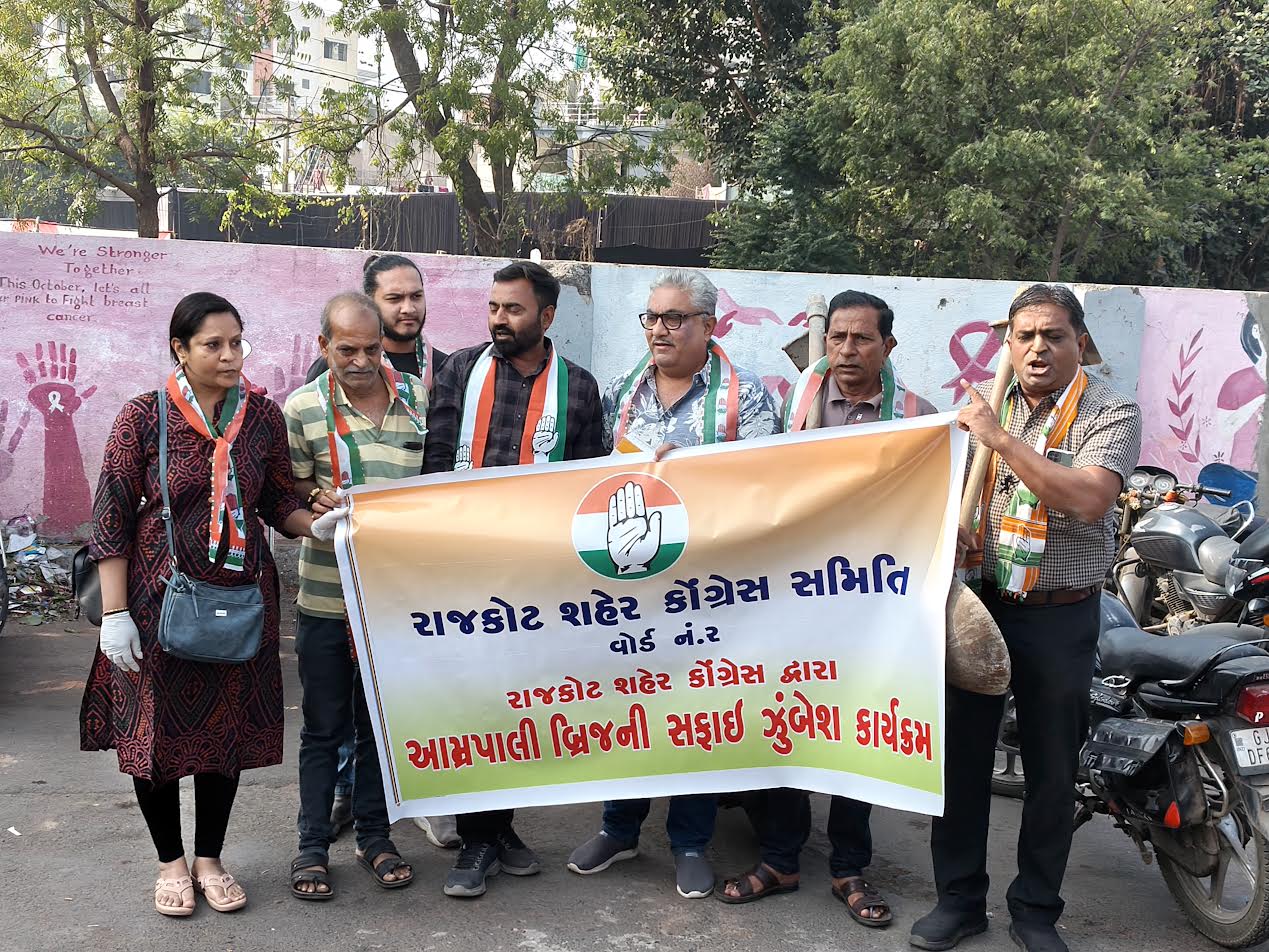 રાજકોટ શહેરના આમ્રપાલી પાસે અન્ડરબ્રિજની ખરાબ હાલત અને મહાપાલિકાના પસૂતેલાથ તંત્ર સામે વિરોધ વ્યક્ત કરવા માટે કોંગ્રેસ પક્ષના કાર્યકરોએ આજે એક અનોખું પ્રદર્શન કર્યું હતું. કોંગ્રેસના કાર્યકરો પાવડા અને તગારા જેવા સફાઈના સાધનો લઈને અન્ડરબ્રિજની સફાઈ કરવા માટે ઘટનાસ્થળે પહોંચ્યા હતા, જોકે પોલીસે તેમને તરત જ અટકાવી દીધા હતા. અને આ કાર્યકરોની અટકાયત કરવામાં આવી હતી. જોકે આ વિરોધ પ્રદર્શનમાં કોંગ્રેસના ગણ્યા ગાંઠ્યા 15 જેટલા કાર્યકરો જ જોડાયા હતા, જે શહેરના રાજકારણમાં ચર્ચાનો વિષય બન્યો હતો. કેમ કે શહેર કોંગ્રેસના કોઇ મુખ્ય નેતાઓ કાર્યક્રમમાં જોવા મળ્યા ન હતા. ગુજરાત પ્રદેશ શક્તિ સભાના ચેરમેન વૈશાલી શિંદેએ જણાવ્યું હતું કે, રાજકોટને રેસકોર્સના કારણે એક હબ કહી શકાય છે, પરંતુ શહેરની દશા અત્યારે ખરાબ થઈ રહી છે. અન્ડરબ્રિજનું કામ પ્રોપર રીતે થયું નથી અને તંત્ર તદ્દન સૂતું છે. તેમણે આક્ષેપ કર્યો હતો કે આજે કોઈપણ પ્રકારનું કામ થતું નથી અને રસ્તાઓ સ્લિપરી થઈ રહ્યા છે. મુખ્યમંત્રી આવે ત્યારે જ રોડ-રસ્તા સાફ થાય છે, અને બીજા દિવસે ફરી કાદવ-કિચડ થઈ જાય છે.