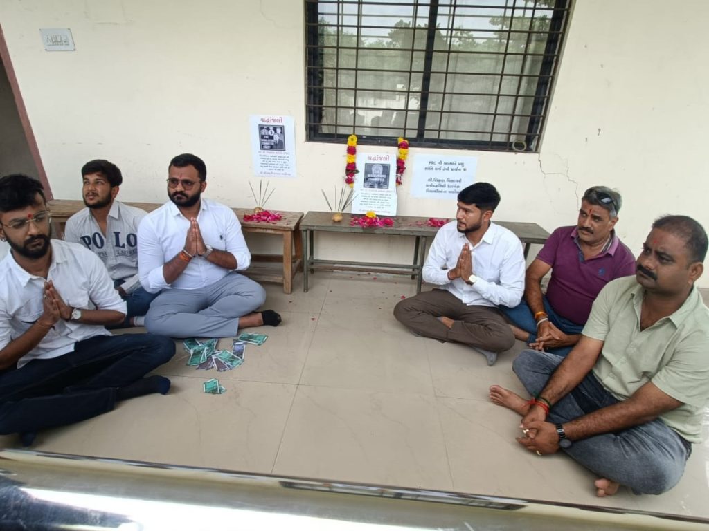 નકલી ચલણી નોટોનો હાર પહેરાવી રામધૂન બોલાવી, છ મહિનાથી ચેરમેનની જગ્યા ખાલી, વિરોધ પ્રદર્શન કરી નિમણૂંક કરવા માંગ, તાળાબંધીની ચિમકી