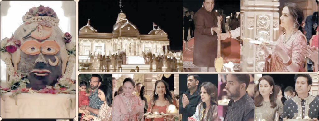 ક્રિકેટર્સ અને બોલિવૂડ સેલેબ્સ ભક્તિમાં તરબોળ દેખાયા મંદિરની પ્રાણ પ્રતિષ્ઠા મહોત્સવ દરમિયાન અંબાણી પરિવારની સાથે ક્રિકેટર સચિન તેંડુલકર અને તેમના પત્ની અંજલી, મહેન્દ્રસિંહ ધોની અને તેમના પત્ની સાક્ષી, બોલિવૂડ સ્ટાર રણવીર સિંહ, દીપિકા પાદુકોણ, આમિર ખાન અને તેની ગર્લફ્રેન્ડ ગૌરી સ્પ્રેટ સાથે ઉપસ્થિત રહ્યાં હતાં. સેલેબ્સે ભસ્મ આરતીનો લહાવો લીધો હતો. તેમજ શિવલિંગની આરતી ઉતારી, શિવજીના ભજન પણ ગાયા હતા.