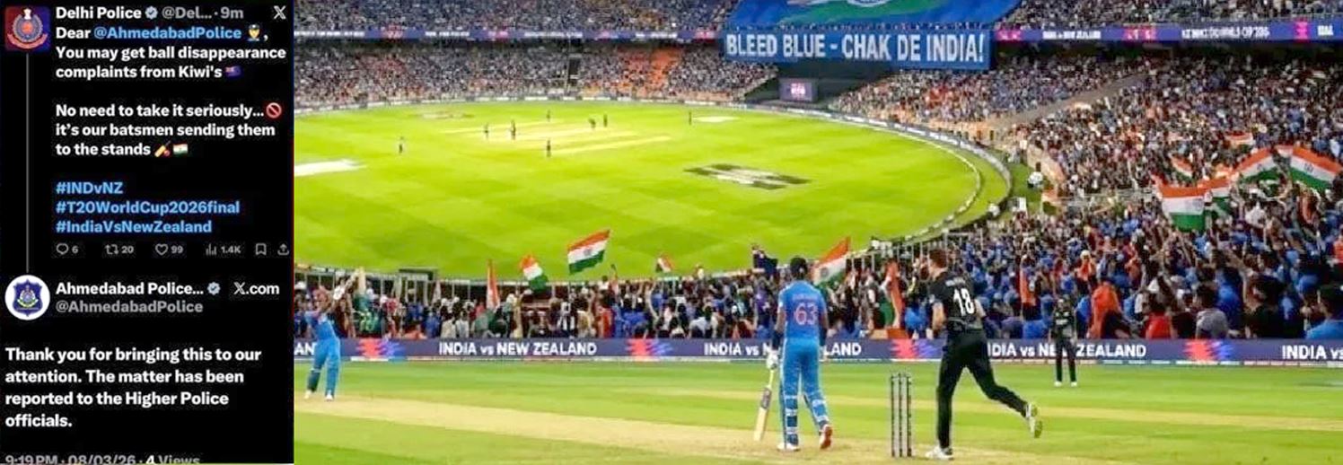 અમદાવાદના નરેન્દ્ર મોદી સ્ટેડિયમમાં ચાલી રહેલી T20 વર્લ્ડ કપ ફાઇનલ દરમિયાન મેદાનમાં જેટલી જ રોમાંચક રમત જોવા મળી રહી હતી, એટલી જ મજા સોશિયલ મીડિયામાં પણ જોવા મળી. ભારત અને ન્યુઝીલેન્ડ વચ્ચે ચાલી રહેલી આ મહત્વપૂર્ણ મેચ દરમિયાન દિલ્હી પોલીસે અમદાવાદ પોલીસને ટેગ કરીને એક મજેદાર ટ્વિટ કરી, જે સોશિયલ મીડિયામાં ઝડપથી વાયરલ થઈ ગઈ.