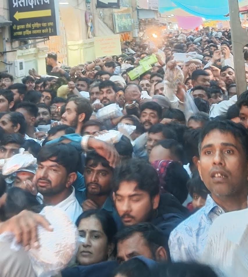 જગત મંદિરે દર્શનાર્થી ઓ માટે અવ્યવસ્થા ના કારણે છપ્પન સીડી સ્વર્ગ દ્વાર પાસે વૂધ્ધો બાળકો મહિલાઓ ગિરદી માં ફસાઈ જતા ધક્કા મુકીના દ્રશ્યો સર્જાયા હતા. અને કિકીયાટી ના અવાજો ગુંજ્યા હતા. વાર તહેવાર પુનમ અમાસ કે અગિયારસ તેમજ શનિ રવિના દિવસો હોય ત્યારે યાત્રાધામ દ્વારકામાં જગત મંદિરે શ્રધ્ધાળુઓની ભિડ જોવા મલ્તી હોય છે. તે છતાં સંબંધિત તંત્ર દ્વારા શ્રધ્ધાળુઓ માટે શાંતિપૂર્ણ દર્શન અને વ્યવસ્થિત લાઇનો ની વ્યવસ્થા ના કરાતા લોકો આક્રોશ વ્યક્ત કર્યો હતો. ભાવિકો આસ્થા સાથે ભગવાન શ્રી દ્વારકાધીશજી ના દર્શનાથે આવતા હોય અવ્યવસ્થા હોવાથી વહિવટી તંત્ર ધ્યાન દેતું નથી.