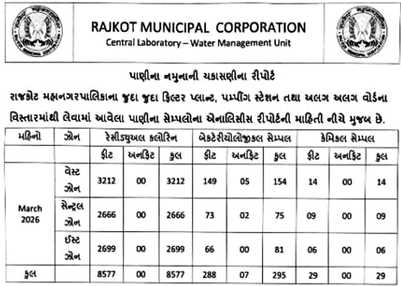 ઉનાળામાં પાણીનો વપરાશ વધતા જ મનપાની આરોગ્ય અને વોટર વકર્સ શાખાએ ચેકીંગનો કામગીરી સઘન બનાવી છે. આરોગ્ય શાખા દ્વારા ખાણીપીણીના સ્થળે જ્યારે વોટર વકર્સ શાખા દ્વારા પાઇપલાઇન દ્વારા આવતા પાણીના સેમ્પલ લેવાનું પ્રમાણ વધાર્યુ છે. શહેરના ત્રણેય ઝોનમાં થઇને દરરોજ 250થી વધુ સેમ્પલ રેન્ડમલી લેવામા આવે છે. દુષિત પાણીની ફરિયાદ આવે કે ન આવે, જે વિસ્તારમાં ફરિયાદ ન હોય તો પણ ત્યાથી રેન્ડમ રીતે સેમ્પલ લઇને લેબોરેટરીમાં મોકલી આપવામા આવે છે. પખવાડિયા પહેલા લેવાયેલા સેમ્પલ રિપોર્ટમાં ન્યૂ રાજકોટના પાંચ વિસ્તાર અને સેન્ટ્રલ એટલે કે મધ્ય રાજકોટમાં બે વિસ્તારમાંથી લેવાયેલા સેમ્પલ લેબોરેટરી પરીક્ષણમાં ફેઇલ થઇને આવ્યા છે.