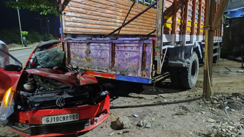 જામનગરની ભાગોળે ઠેબા રોડ પર આજે સવારે માર્ગ ઉપર બંધ પડેલા ટ્રકની સાથે જી.જે. 10 સી.એન. 8900 નંબરની કાર ધડાકાભેર અથડાઈ પડી હતી.જે કારની ટક્કર એટલી જોરદાર હતી, કે કાર પડીકું વળી ને ટ્રકની પાછળની બોડી માં ઘૂસી ગઈ હતી, અને કારનો ભૂકકો બોલી ગયો હતો.