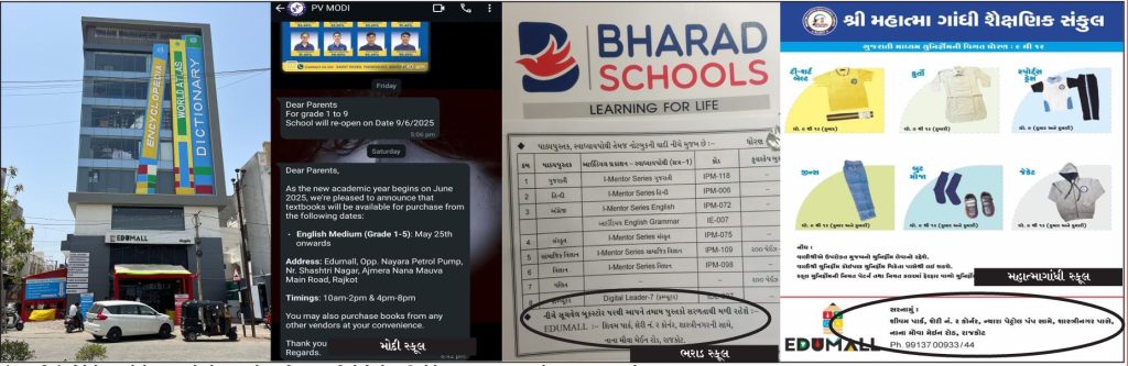 નાના મવા રોડ પર આવેલ એજ્યૂમોલ માંથી અલગ અલગ પાંચ જેટલી સ્કૂલોના વિદ્યાર્થીઓને જરૂરી સ્ટેશનરી-યુનિફોર્મ ખરીદવાની ફરજ પાડવામાં આવી રહી છે. એજ્યૂમોલ કંપનીના કંપની રજીસ્ટ્રેશનના ડેટા પ્રમાણે જય ધર્મેન્દ્ર મેહતા અને શ્રીકાંત વનુભાઈ તન્ના એમ બે પાર્ટર છે. રાજકોટ સ્વનિર્ભર શાળા સંચાક મંડળના પ્રમુખ ડી.વી. મહેતાના પુત્ર જય માલિક હોય એજ્યુમોલ પાસે સરતાથી કાનગી શાળાના સંચાલકો વિદ્યાર્થીઓને ફરજિયાત ગ્રાહક તરીકે મોકલી દે છે.