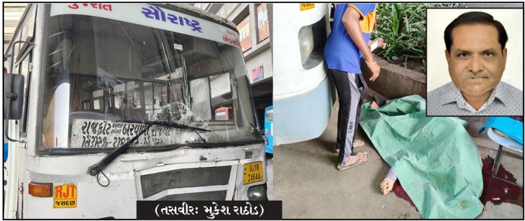 બનાવની વધુ વિગતો મુજબ,શહેરના મોટામવા કર્ણાવતી પાર્ટી પ્લોટ સામે આવેલા અલ્ટોસા બી વિંગ બ્લોક નં 502માં રહેતા દિનેશભાઈ લીલાધરભાઈ મારવણીયા ઉ.65 નામના વૃધ્ધ સમી સાંજે ઢેબર રોડ પર આવેલા એસટી બસ સ્ટેન્ડ પાસે બહાર રોડ પર ઉભા હતા ત્યારે રાજકોટ-બરવાળા રૂૂટની બસે વૃધ્ધને પાછળથી ઠોકરે લેતા માથે-શરીરે ગંભીર ઈજા પહોંચી હોવાથી તાકિદે સારવાર અર્થે સિવિલ હોસ્પિટલમાં ખસેડાતા ફરજ પરના તબીબે વૃધ્ધને તપાસી મૃત જાહેર કરતા હોસ્પિ.ચોકીના સ્ટાફે નોંધ કરી એ ડીવીઝન પોલીસને જાણ કરતા પીએસઆઈ બી.વી. બોરીસાગર સહિતનો સ્ટાફ દોડી જઈ જરૂૂરી કાર્યવાહી કરી હતી.