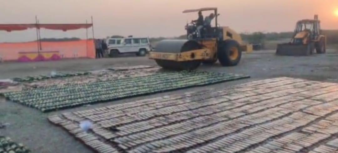 જામનગર જિલ્લાના ધ્રોલ પોલીસ સ્ટેશન હેઠળના વિસ્તારમાં છેલ્લા કેટલાક સમયથી ઇંગ્લિશ દારૂૂ અને બિયર નો માતબર જથ્થો પકડી પાડવામાં આવ્યો હતો, જે પૈકી રૂૂપિયા 86,05,450 ની કિંમત માં 11,039 નંગ દારૂૂ અને બિયરની બાટલીના જથ્થા પર બુલડોઝર ફેરવી દેવાયું હતું.
