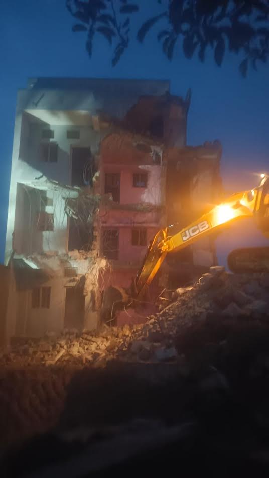 એસ્ટેટ શાખાની ટીમ દ્વારા ચાલુ વરસાદે ચાર માળનું બિલ્ડિંગ તોડી પાડવા કાર્યવાહી