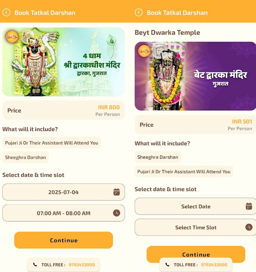 જેમાં દ્વારકા તથા બેટ દ્વારકા તીર્થ સ્થાનોમાં તત્કાલ દર્શન કરવા હોય તો દિવસ અને સમય સ્લોટ સાથે દ્વારકાધીશ મંદિરમાં વ્યકિતદીઠ 800 અને બેટ દ્વારકાધીશ મંદિરમાં વ્યકિતદીઠ 501 રૂૂપિયા લખાયેલા છે.જો કે આ અંગે સૂત્રોમાંથી મળતી માહિતી અનુસાર જે તે તીર્થસ્થાનનું વહીવટી તંત્ર અજાણ હોય આ એપ્લીકેશન સામે કાયદેસરની કાર્યવાહી પણ થઈ શકે છે.