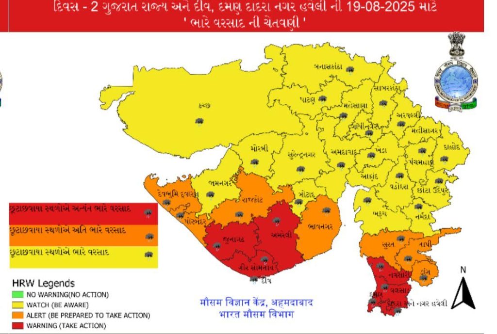 હવામાન વિભાગે આપેલી માહિતી પ્રમાણે, આજે મંગળવારે 19મી ઓગસ્ટના રોજ રાજ્યના કેટલાક વિસ્તારોમાં રેડ એલર્ટ સાથે અત્યંત ભારે વરસાદની આગાહી આપવામાં આવી છે. જૂનાગઢ, અમરેલી, ગીરસોમનાથ, નવસારી, વલસાડમાં અત્યંત ભારે વરસાદની આગાહી આપવામાં આવી છે. આ સાથે દ્વારકા, પોરબંદર, રાજકોટ, ભાવનગર, સુરત, તાપી અને ડાંગમાં અતિભારે વરસાદની આગાહી આપવામાં આવી છે. આ ઉપરાંતના તમામ જિલ્લાઓમાં ભારે વરસાદની આગાહી આપવામાં આવી છે.આ સાથે હવામાન વિભાગે, બુધવારે 20મી તારીખે પણ રાજ્યમાં ભારેથી અત્યંત ભારે વરસાદની આગાહી આપવામાં આવી છે. 21મીથી વરસાદનું જોર ઘટતું હોય તેમ લાગી રહ્યું છે. આ તારીખે ભારેથી અતિભારે વરસાદની આગાહી આપવામાં આવી છે.
