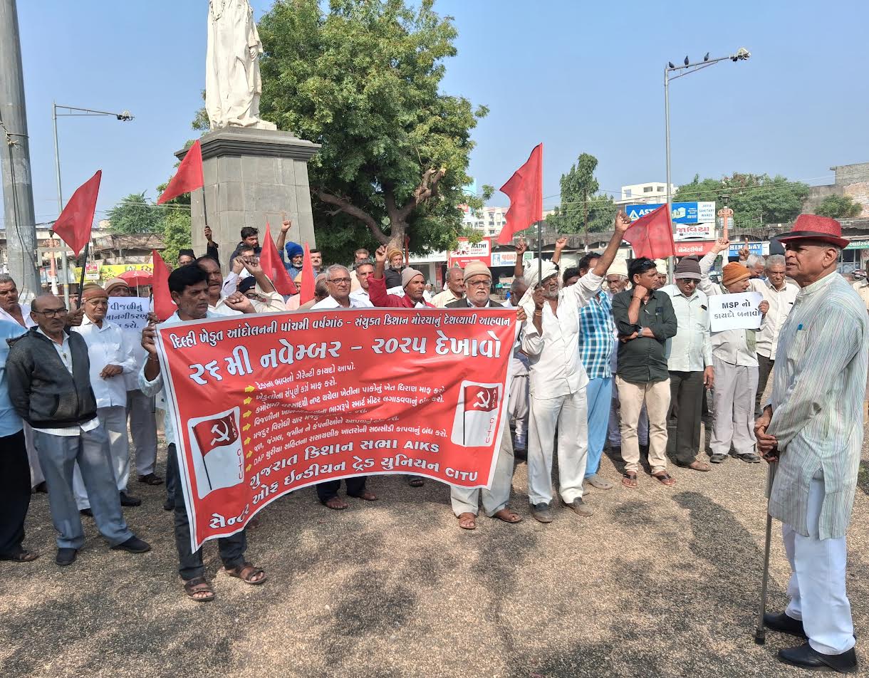 આ નીતિ થી ખેતી બરબાદ થવાનો ભય વ્યક્ત કર્યો કેન્દ્ર સરકારે ખેડૂતો વિરોધી નીતિ ની જેમ મજદૂર વિરોધી નીતિઓ અખતયાર કરી છે 29 મજદુર શ્રમ કાયદાઓને કેન્દ્ર સરકારે તોડી નાખીને નવાચાર લેબર કોડ બનાવેલ છે તેનાથી કામદારોનું ભવિષ્ય પણ અંધકારમય બનશે દેશના સંયુક્ત કિસાન મોરચાએ ઐતિહાસિક દિલ્હી કેન્દ્ર ખેડૂત આંદોલનના પાંચમા વર્ષગાંઠ નિમિત્તે કિસાન મજૂર એકતા મજબૂત બનાવવા 26 નવેમ્બરના રોજ દેશભરમાં મજદુર કિસાન એકતા દિવસ મનાવવા હાકલ કરી છે તેના ભાગરૂૂપ ગુજરાત કિસાન સભા રાજકોટ જિલ્લા સમિતિ અને અસંગઠિત ક્ષેત્ર કામદાર સંગઠન સીટુના કાર્યકર્તાઓએ દેખાવો યોજી માંગણીના સૂત્રોચાર કર્યા હતા દેખાવો કાર્યક્રમમાં ગુજરાત કિસાન સભાના રાજકોટ જિલ્લા પ્રમુખ કારાભાઈ બારૈયા ઉપપ્રમુખ લક્ષ્મણભાઈ પાનેરા મંત્રી દિનેશભાઈ કંટારીયા તેમજ ખીમાભાઈ આલ કાળાભાઈ ચંદ્રવાડીયા પમીબેન ડેર નર્મદાબેન કપુપુરા નિર્મળાબેન ગજેરા સહિત મોટી સંખ્યામાં ખેડૂત મજબૂર કાર્યકર્તાઓ ઉપસ્થિત રહ્યા હતાં.