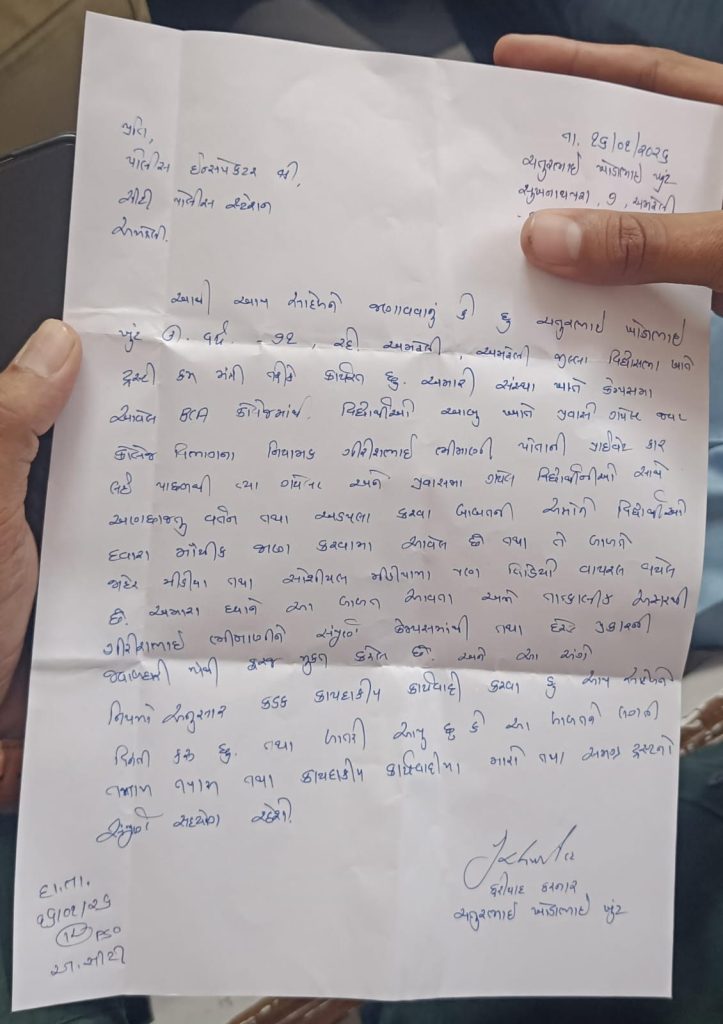 રાજસ્થાનના માઉન્ટ આબુ ખાતેના પ્રવાસ દરમિયાન નિયામક ગીરીશ ભીમાણીએ એક વિદ્યાર્થીની સાથે અડપલાં કર્યા હોવાનો મામલો સામે આવતા વિદ્યાર્થી આલમમાં ભારે રોષ જોવા મળ્યો હતો. આ ઘટનાના વિરોધમાં ABVPદ્વારા નિયામક સામે પોલીસ ફરિયાદ અને કડક પગલાંની માંગ સાથે સંસ્થાના પટાંગણમાં ધરણા પ્રદર્શન યોજવામાં આવ્યું હતું.