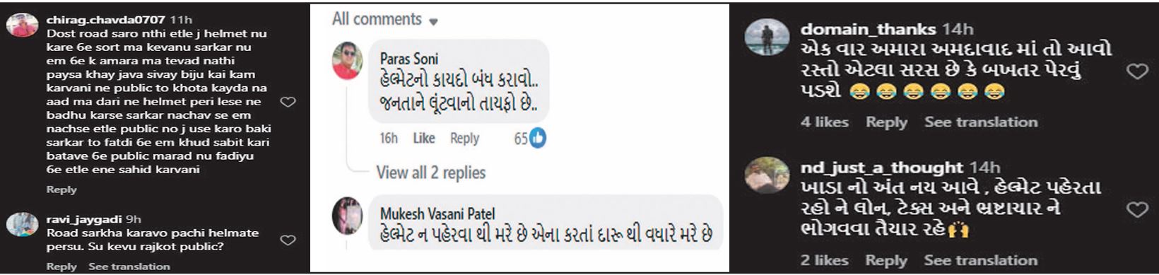 ગઇકાલે જ રાજકોટ આવેલા રાજ્યના ગૃહમંત્રી હર્ષ સંઘવીએ પણ હેલ્મેટ ફરજિયાત કરવા પાછળ દંડ ઉઘરાવવા નહીં પરંતુ ટુ-વ્હિલર વાહન ચાલકોની સલામતી સુનિશ્ર્ચિત કરવાનો હોવાનુ સ્પષ્ટ કર્યુ છે. પરંતુ સોશિયલ મીડિયાના ખેલાડીઓ હેલ્મેટના નિયમો અંગે કટાક્ષ સાથે અલગ અલગ મંતવ્યો રજૂ કરી રહ્યા છે.