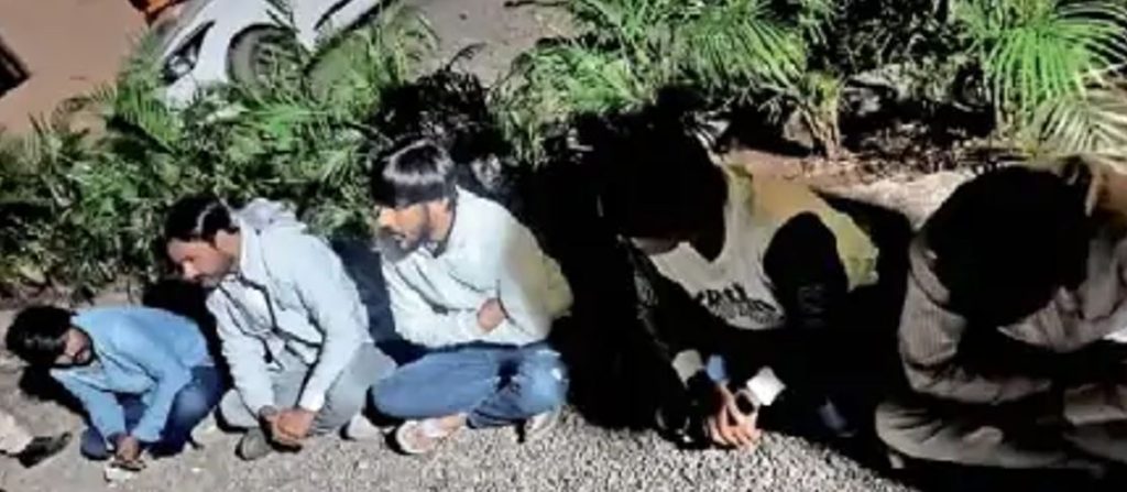 ફાર્મમાં પ્રથમ ક્વાર્ટરની સામે આવેલ ગાર્ડનમાં નશો કરેલી હાલતમાં ડાન્સ કરતા રાજકોટમાં કુવાડવા રોડ પર ગ્રીનલેન્ડ ચોકડી પાસે આવેલ શ્રી બંગ્લોઝમાં રહેતા 25 વર્ષીય બિલ્ડર નિખિલ મહેશ રૈયાણી, તેનો પાડોશી રોહન શૈલેષ વસોયા, રાજકોટ ગ્રીનલેન્ડ ચોકડી પાસેના તિરુપતિ બાલાજી પાર્કમાં રહેતો 22 વર્ષીય વિનીત ઉર્ફે ઉદય સંજય ગાધેર, તેનો પાડોશી 22 વર્ષીય સાહિલ જીતેન્દ્ર નૈના અને રાજકોટમાં મોરબી રોડ ગીરીરાજ પાર્ટી પ્લોટ ની પાછળ રહેતો ઈમીટેશન નો ધંધો કરતો 22 વર્ષીય જતીન ઉર્ફે ખુશાલ અતુલ ગોહેલને કેફી પીણું પીધેલી હાલતમાં ઝડપી લીધા હતા.