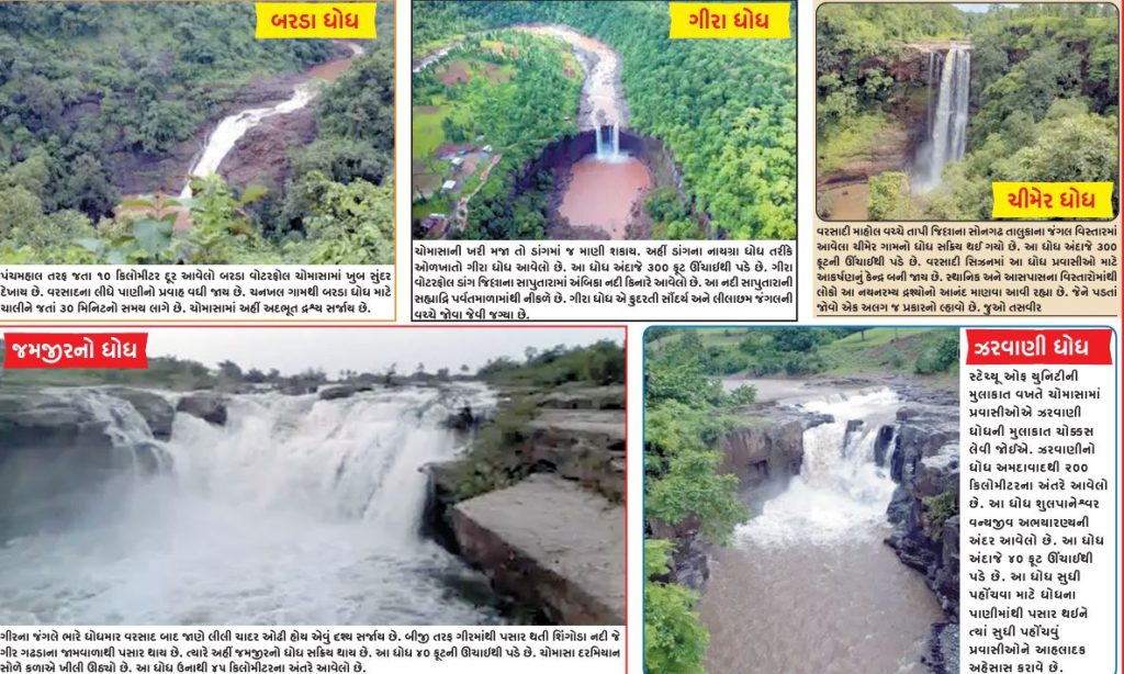 ગુજરાતના તાપી જિલ્લાના સોનગઢના જંગલમાં આવેલો ચીમેરનો ધોધ, ડાંગ જિલ્લામાં નાયગ્રા ધોધ તરીકે વિખ્યાત ગીરા ધોધ, સ્ટેચ્યુ ઓફ યુનિટીના રસ્તે આવેલો ઝરવાણીનો ધોધ, ગીરના જંગલમાં ઉના નજીક આવેલો જમજીરનો ધોધ તેમજ પંચમહાલના રસ્તે ચનખલ ગામમાં જંગલમાં આવેલ બરડા ધોધ હાલ લીલા છમ જંગલો વચ્ચે સોળે કળાએ ખીલી ઉઠયા છે. પ્રવાસીઓ માટે ચોમાસાની સીઝનમાં આ પાંચેય ધોધ ફરવા અને માણવા જેવા બની રહ્યા છે. ચોમાસામાં આ ધોધ જોવાની અલગ જ મજા છે.