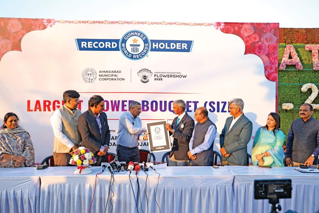 અમદાવાદ મ્યુનિ. દ્વારા ઈન્ટરનેશનલ ફ્લાવર શોમાં તૈયાર કરાયેલા લાર્જેસ્ટ ફ્લાવર બૂકેને ગિનિસ બુકમાં સ્થાન મળ્યું છે. 10.24 મીટર ઊંચાઈ અને 10.84 મિટરની ત્રિજ્યા ધરાવતા આ બૂકેએ યુએઈના રેકોર્ડને તોડીને પોતાનો નવો રેકોર્ડ બનાવ્યો છે. આમ, સતત બીજા વર્ષે ફ્લાવર શોનું નામ ગિનિસ બુકમાં ચમક્યું છે. ગતવર્ષે સૌથી લાંબી ફ્લાવર વોલ માટે ગિનિસ બુકમાં સ્થાન મળ્યું હતું.