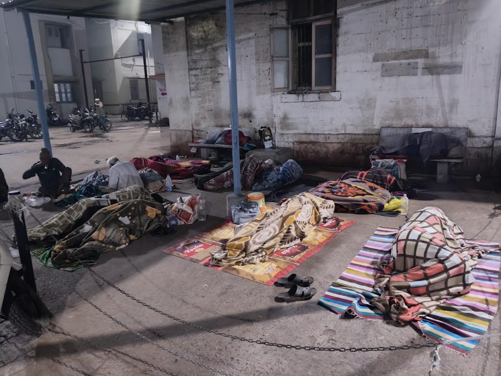 સૌરાષ્ટ્રની સૌથી મોટી એવી રાજકોટની પંડિત દિનદયાળ ઉપાધ્યાય સિવિલ હોસ્પિટલમાં દર્દીઓ માટે તો પુરતી સુવિધા નથી પણ દર્દીઓના ગરીબ સગા-સંબંધીઓ માટે તો સમુળગી કોઈ વ્યવસ્થા ન હોવાથી લોકોને કડકડતી ટાઢમાં પણ ખુલ્લામાં સુવુ પડે છે. હોસ્પિટલના કમ્પાઉન્ડમાં આવેલ વિશાળ છાપરામાં અન્નક્ષેત્રએ ધરાર કબજો જમાવ્યો છે. જ્યારે પથિકાશ્રમમાં વ્યવસ્થા છે પરંતુ દર્દીઓના સગાઓને આ અંગે જાણ કરવાની કોઈ વ્યવસ્થા નથી તેથી ખુલ્લામાં ગોદડા ઓઢીને રાતે સૂઈ જાય છે. શિયાળો જામે તે પહેલા તંત્ર યોગ્ય વ્યવસ્થા કરે તેવી લાગણી અને માંગણી ઉઠી છે. (તસવીર: મુકેશ રાઠોડ)