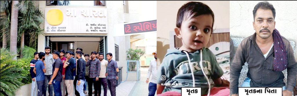 વધુ વિગતો મુજબ, રવાણી ખીજડીયા ગામે રહેતાં અને ખેતી કરી ગુજરાન ચલાવતાં જનકસિંહ જાડેજાના દિકરી મિતાંશીબા (ઉ.વ.11 મહિના)ને મંગળવારે તાવની સારવાર માટે રાજકોટ નાના મવા રોડ રાજનગર ચોક પાસે આવેલી મા શારદા હોસ્પિટલમાં દાખલ કરાયા બાદ ગઇકાલે સાંજે તેણીને સૌરાષ્ટ્ર હોસ્પિટલમાં રીફર કરાયા બાદ મોત નિપજતાં માલવીયાનગર પોલીસને જાણ કરવામાં આવતાં હેડકોન્સ. કે. જી. ઝાલા સહિતે સૌરાષ્ટ્ર હોસ્પિટલ ખાતે પહોંચી જરૂૂરી કાર્યવાહી કરી હતી. પરિવારજનોએ બાળકીના મૃત્યુ પાછળ ડોક્ટરની બેદરકારીનો આક્ષેપ કરતાં મૃતદેહને ફોરેન્સિક પોસ્ટમોર્ટમ માટે ખસેડયો હતો.
