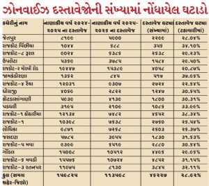 વર્ષ 2024-25 માં 12,031 દસ્તાવેજો નોંધાયા હતા, જે 2025-26 માં ઘટીને 9,307 થઈ ગયા છે. આ વર્ષે 2,724 દસ્તાવેજો ઘટાડોનોંધાયો છે. (ગ્રામ્ય): 9,024 દસ્તાવેજોથી ઘટીને 6,386 દસ્તાવેજો થયા છે. 2,638 દસ્તાવેજો ઘટાડોનોંધાયો છે.