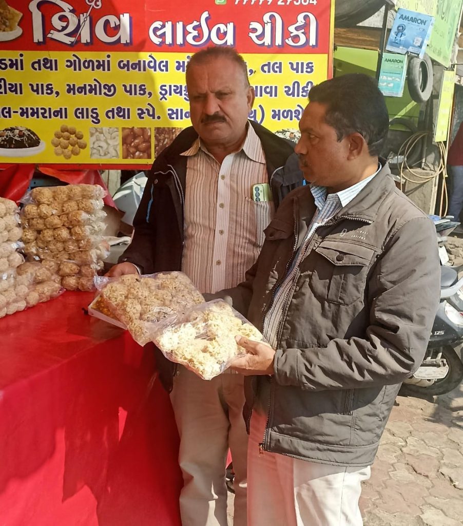જે અન્વયે (1)મોમાઇ ચીકી- પારેવડી ચોક, (2)શિવ ચીકી- પારેવડી ચોક, (3)જય બજરંગ લાઈવ ચીકી- પારેવડી ચોક, (4)જય સિયારામ ચીકી- પારેવડી ચોક, (5)જય જલારામ ચીકી- પારેવડી ચોક, (6)પાર્થ ચીકી- પારેવડી ચોક, (7)જય શંકર ચીકી- ભગવતી પરા, (8)ક્રિષ્ના સિઝન સ્ટોર -સહકાર મેઇન રોડ (9)સંતોષ સિઝન સ્ટોર- સહકાર મેઇન રોડ (10)સોનલ સિઝન સ્ટોર -સહકાર મેઇન રોડની ચકાસણી કરવામાં આવેલ. તેમજ ફુડ સેફ્ટી સ્ટાન્ડર્ડ એક્ટ-2006 હેઠળ દર્શાવેલ નીચે મુજબ વિગતે કુલ 05 નમૂના લેવામાં આવેલ. જેમાં તલનું કચરીયું (લુઝ): સ્થળ- મોમાઇ ચીકી, પારેવડી ચોક, તલ ચીકી (લુઝ): સ્થળ- શિવ ચીકી, પારેવડી ચોક, શીંગ ચીકી (લુઝ): સ્થળ- જય બજરંગ લાઈવ ચીકી, પારેવડી ચોક, રાજગરાના લાડુ (લુઝ): સ્થળ- જય સિયારામ ચીકી, પારેવડી ચોક, ચાંદની પાર્ક (લુઝ): સ્થળ- પાર્થ ચીકી, પારેવડી ચોક, રાજકોટનો સમાવેશ થાય છે. આ ઉપરાંત સર્વેલન્સ ચેકિંગ દરમિયાન નાનામવા ચોક, નાનામવા રોડ, રાજકોટ મુકામે આવેલ “સિધ્ધેશ્વર ઢોસા તથા નાનામવા રોડ, રાજકોટ મુકામે આવેલ દાબેલી વાલે અને ગોલ્ડન વ્યૂ કોમ્પલેક્ષ, રાજકોટ મુકામે આવેલ “ચોકો બાઇટ” પેઢીની તપાસ કરતા પેઢીને લાયસન્સ મેળવવા તથા હાઈજેનિક કન્ડિશન જાળવવા બાબતે નોટીસ આપવામાં આવેલ. અન્ય કામગીરીમાં (01)દર્શન ઘૂઘરા -લાઇસન્સ મેળવવા બાબતે સૂચના (02)ભોલેનાથ આઇસ્ક્રીમ -લાઇસન્સ મેળવવા બાબતે સૂચના (03)માધવ ડેરી ફાર્મ -લાઇસન્સ મેળવવા બાબતે સૂચના (04)રામદેવ ડેરી ફાર્મ -લાઇસન્સ મેળવવા બાબતે સૂચના (05)શ્રીજી આઇસ્ક્રીમ -લાઇસન્સ મેળવવા બાબતે સૂચના (06)ફલેવર સોડા શોપ -લાઇસન્સ મેળવવા બાબતે સૂચના (07)શ્યામ ગાંઠિયા -લાઇસન્સ મેળવવા બાબતે સૂચના (08)ન્યુ બોમ્બે સ્ટાઈલ પાણિપુરી -લાઇસન્સ મેળવવા બાબતે સૂચના આપવામાં આવેલ.